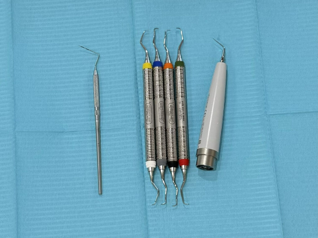 ・ハンドスケーラーによる精密な除去- 超音波スケーラーでは届きにくい部分や、歯周ポケットの奥深くにある歯石は、手動の器具(ハンドスケーラー)を使って丁寧に除去します。
