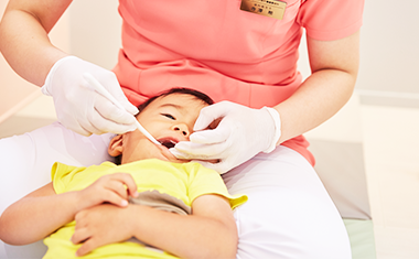 お子さまのむし歯が多い原因は、乳歯の歯に凹凸が多く、むし歯の原因となる細菌が繁殖しやすい環境があるからです。凹凸を少なくするシーラントや細菌への抵抗力をつけるためのフッ素塗布、日々の歯磨きなどを、継続的に行うことが予防につながります。また、細菌の感染経路は、周りの大人であるケースも多いため、ご家族の歯の状態もお子さまの歯の健康にとって非常に大切です。